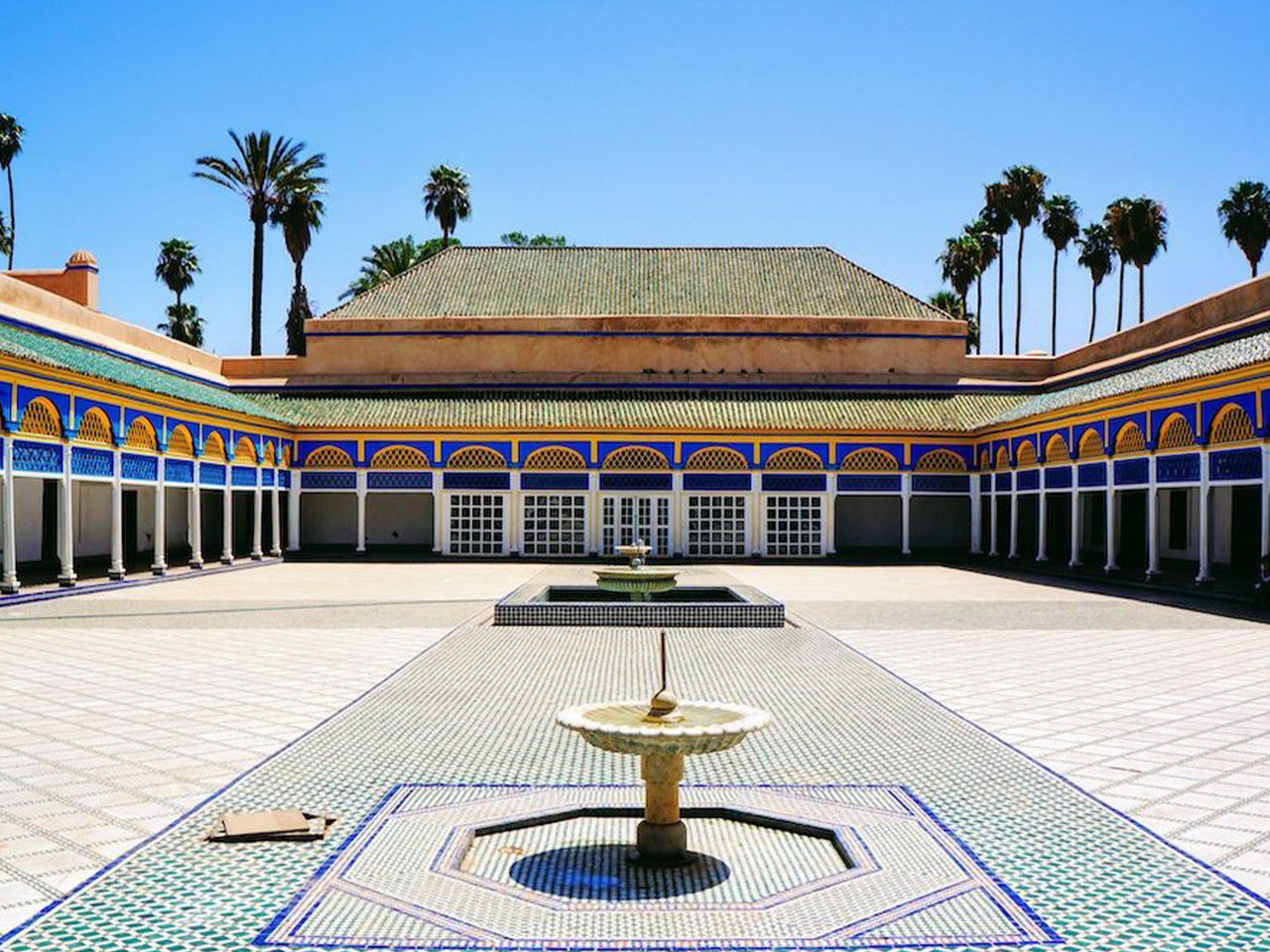 Visit the Bahia Palace and its gardens build in the late 19th century by the architect El Mekkin and a residence for the Vizier, Ba Ahmed Ben Moussa. The palace is a true masterpiece, outstanding for the sophistication of its décor, its garden, fountains and tree shaded courtyards and for is architectural design. The place was home to the Vizier’s family, which included 4 wives, 24 concubines and countless children.